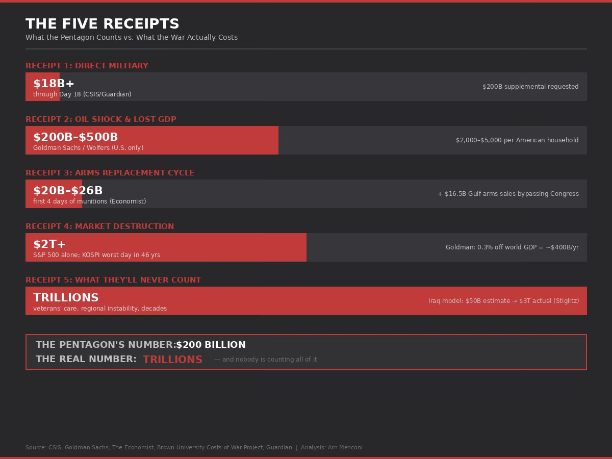 The $200 billion headline is the opening bid. The total, when someone eventually does the full accounting, will be measured in trillions. And the people who will pay it—the veterans, the taxpayers, the small-business owners whose community bank can no longer lend, the families in Beirut and Tehran and Gaza whose schools and hospitals have been converted to rubble—did not get a vote on any of it.