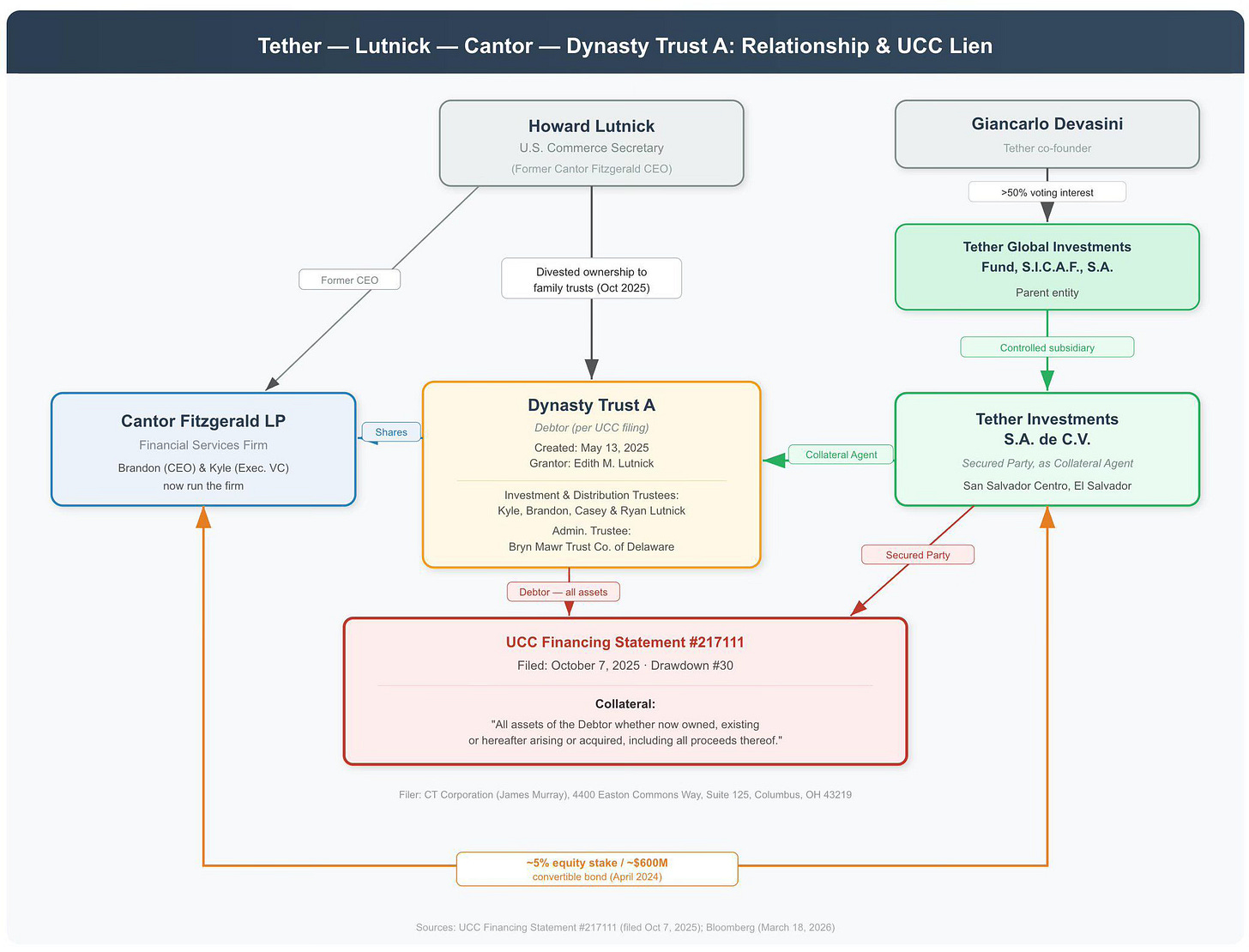 Then Bloomberg reported, on March 18, 2026, what the paper trail revealed: at approximately the same time as the ownership transfer, “Dynasty Trust A,” which benefits all four Lutnick children, borrowed an undisclosed sum from Tether. A UCC Financing Statement (#217111), filed in New York State on October 7, 2025, shows the loan is secured by “all assets of the Debtor, whether now owned, existing or hereafter arising or acquired, including all proceeds thereof.” The secured party: Tether Investments S.A. de C.V., domiciled in San Salvador Centro, El Salvador. A FINRA BrokerCheck filing confirms that Dynasty Trust A owns more than 50% of Cantor Fitzgerald’s equity. Tether’s lien covers the controlling stake in a Federal Reserve primary dealer. The 5% equity stake in Tether — acquired via a $600 million convertible bond in April 2024 — could be worth $25 billion if Tether reaches its target valuation of $500 billion.