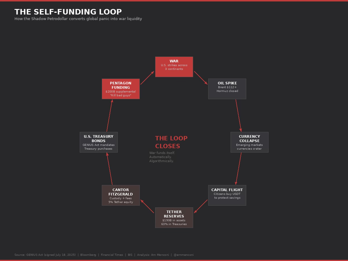 So the woman’s savings—her hedge against the instability of her own economy—flow through Tether, into Cantor Fitzgerald’s custody, and land in the U.S. Treasury market, where they fund the government borrowing that pays for Tomahawk cruise missiles that destroy infrastructure in Iran, which spikes oil prices, which destabilizes her economy further, which drives more capital flight into USDT, which purchases more Treasuries, which funds more missiles.